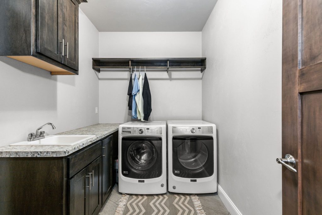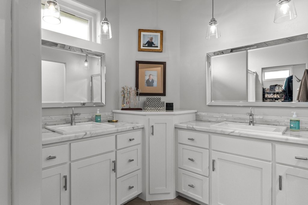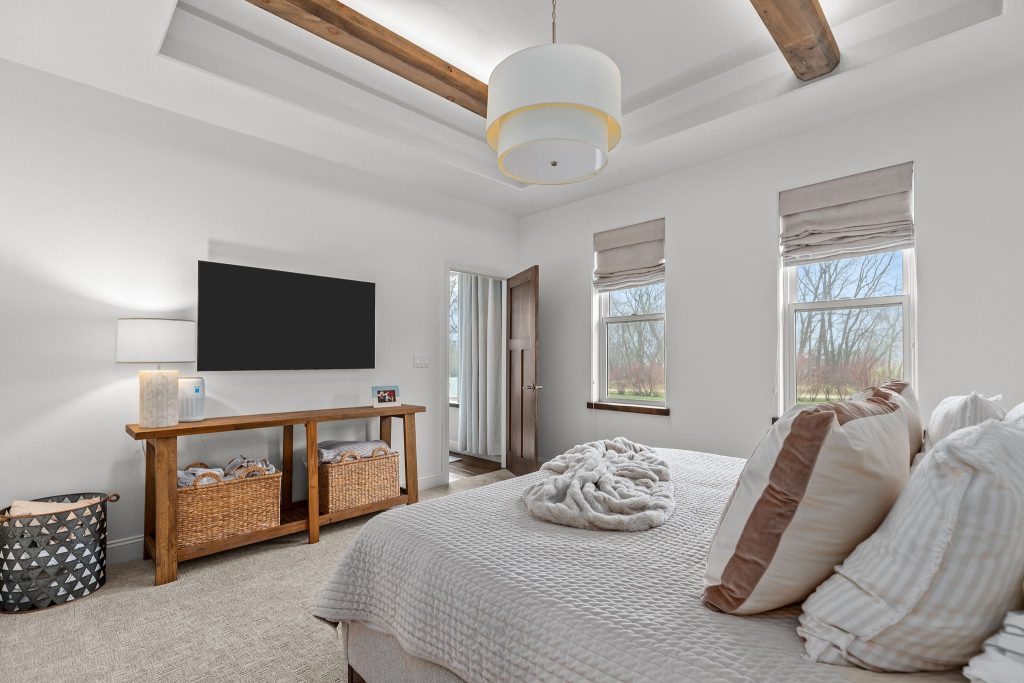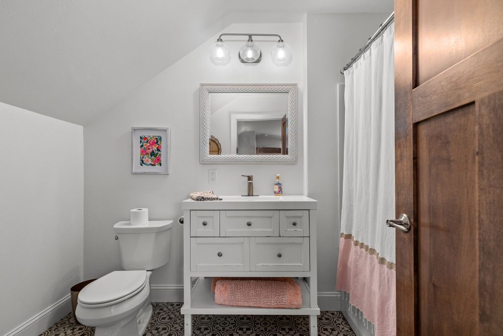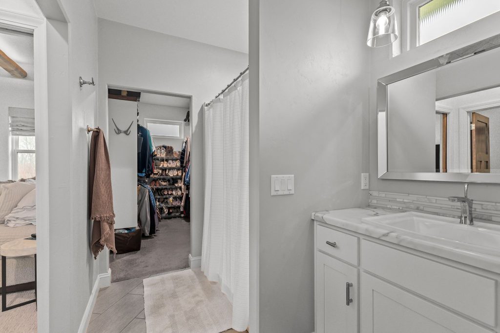 The main-level primary suite offers comfort and privacy, while the upper level includes a second primary suite tucked behind a hidden door. This adds flexibility to the home’s layout and gives the upper level a unique and memorable design feature.